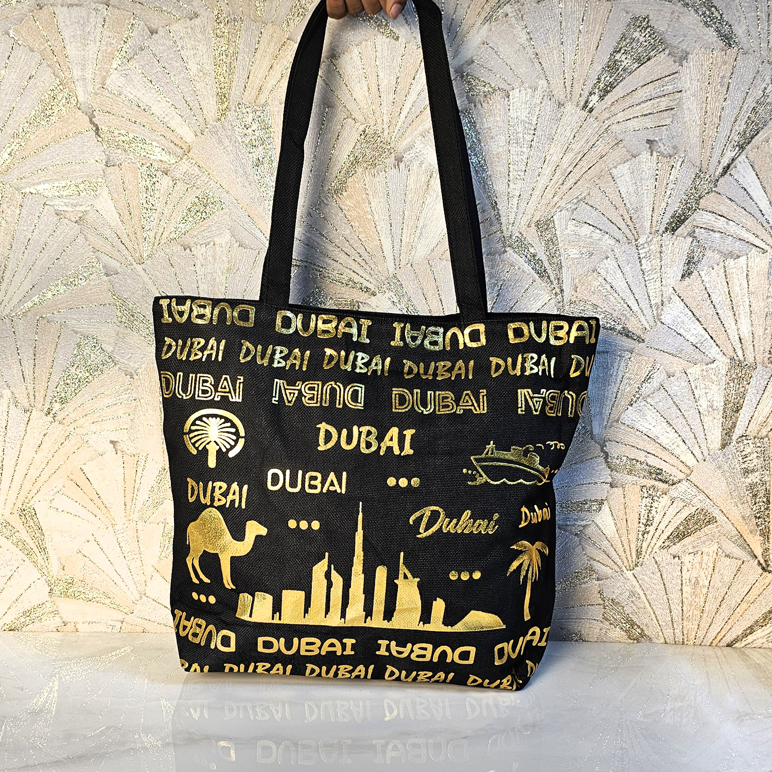 Stylish and spacious UAE Beach Bag with Gold Foil Print, perfect for beach days, shopping, or casual outings. Lightweight yet durable, with a touch of Dubai glamour.