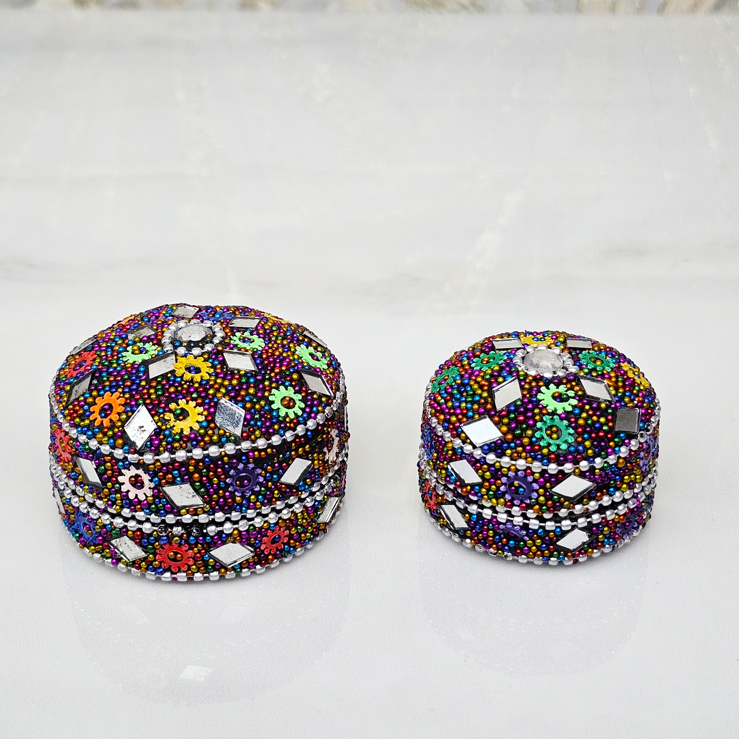 Handcrafted aluminum decorative box set of 2 with colorful design – perfect for pills, candies, or small jewelry.