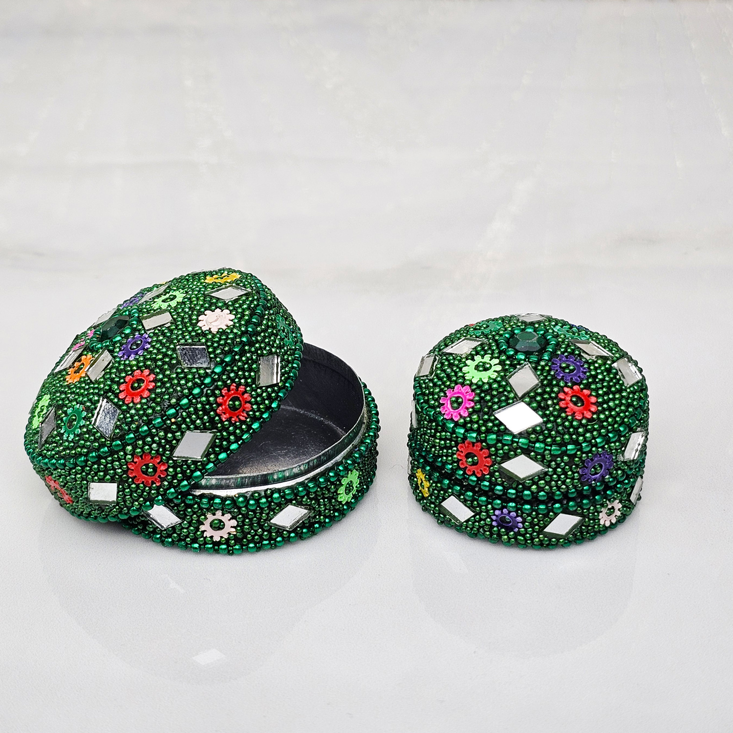 Add a touch of charm to your space with this set of 2 aluminum decorative boxes, beautifully handcrafted with colorful designs. Each box showcases detailed hand decoration that makes it not only functional but also a piece of art. Compact yet elegant, these boxes are perfect for storing small items such as pills, candies, rings, earrings, or other delicate jewelry pieces. Lightweight and durable, they make a lovely gift option or a stylish addition to your home décor.