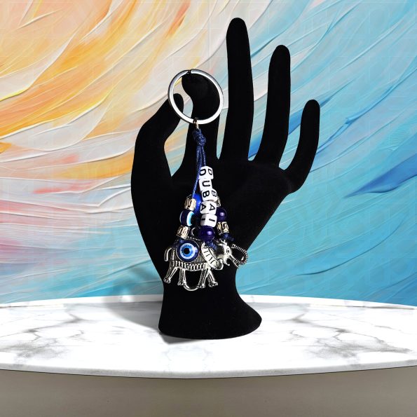 Shop the Dubai UAE Blue Eye Keychain featuring a unique silver elephant design. A perfect souvenir or gift symbolizing protection and good luck. Available now!