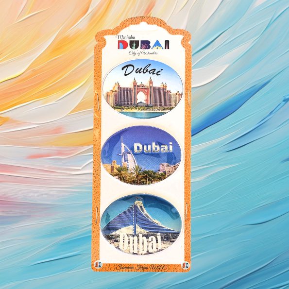 This set of three colorful oval-shaped magnets showcases iconic Dubai landmarks, including the Burj Khalifa and Burj Al Arab, in vibrant blue hues. Perfect for souvenirs, gifts, or adding a touch of Dubai to your space. These magnets capture the essence of Dubai’s modern elegance and architectural marvels.