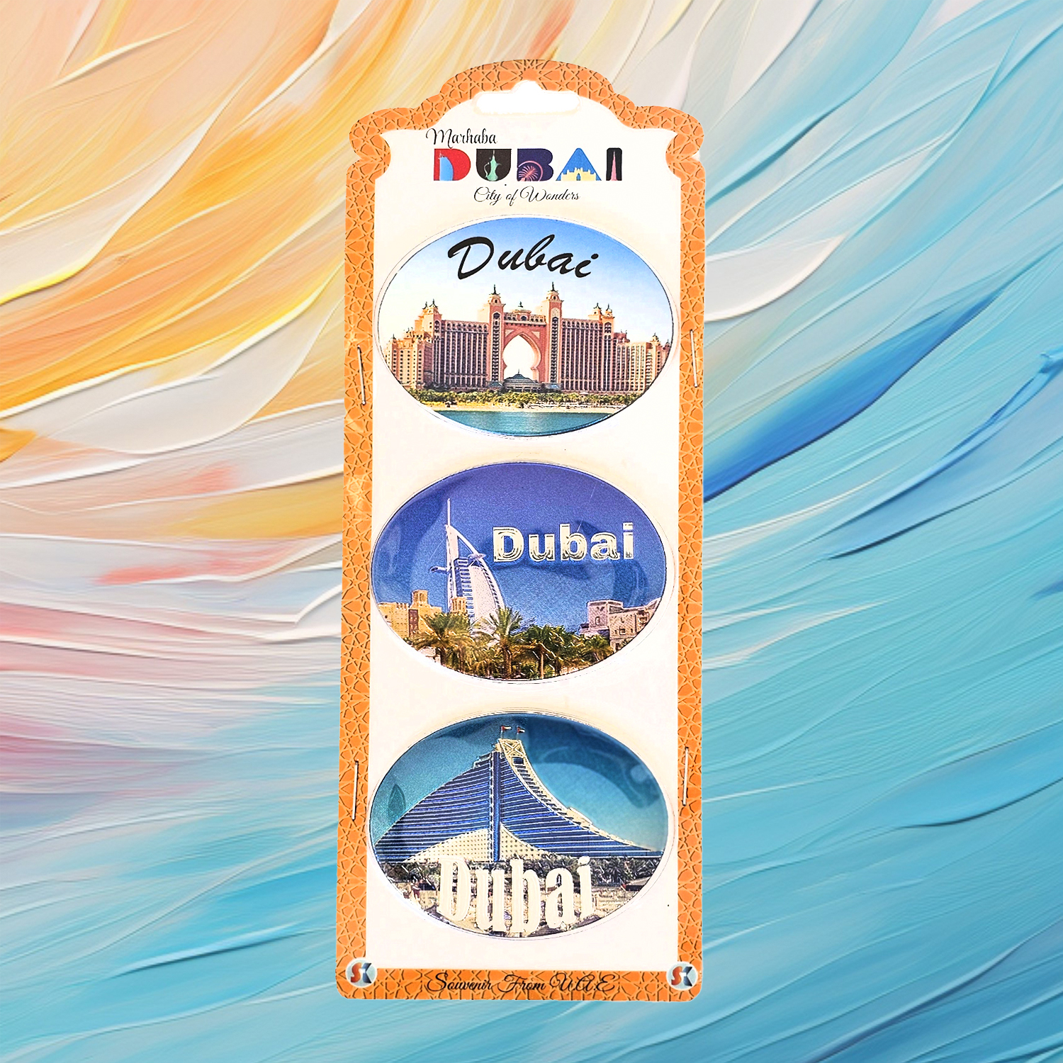 Explore the Dubai UAE Magnet Set featuring 3pcs oval-shaped magnets with colorful designs of the Burj Khalifa and Burj Al Arab. A unique souvenir capturing Dubai’s beauty. Great for gifting or home decor.