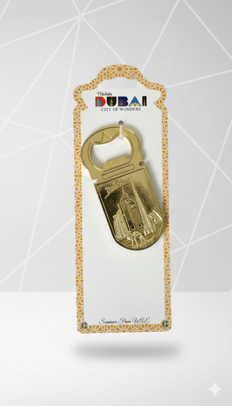 Add a touch of Dubai’s iconic landmarks to your home with this beautifully crafted metal bottle opener fridge magnet. Featuring detailed golden designs of the Burj Al Arab and Burj Khalifa, this souvenir piece combines functionality with elegance. Perfect for collectors and as a unique gift from Dubai.