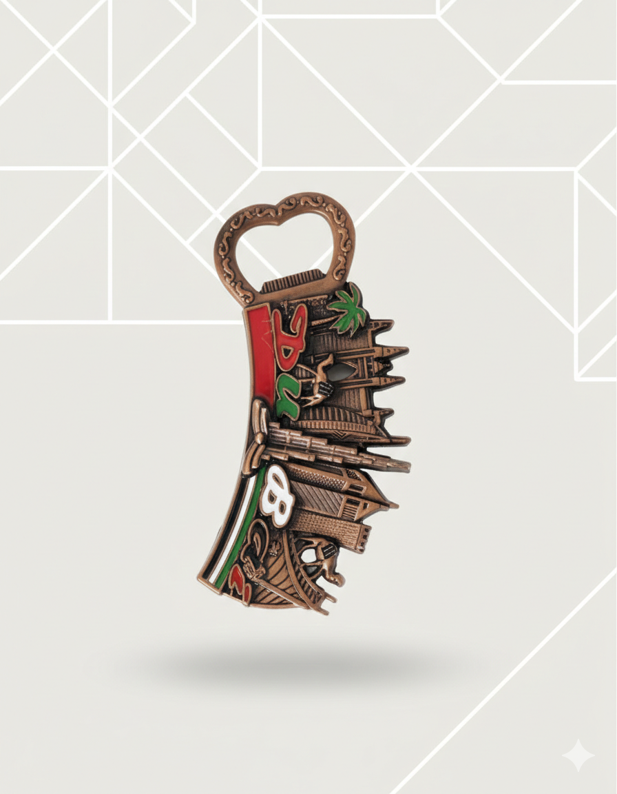 Bring home a piece of Dubai’s iconic skyline with this beautifully crafted metal bottle opener fridge magnet. Featuring the famous Burj Al Arab and Burj Khalifa in a stunning brown finish, this 2-in-1 souvenir is both functional and decorative. Perfect for adding a touch of Dubai to your kitchen or gifting to loved ones.