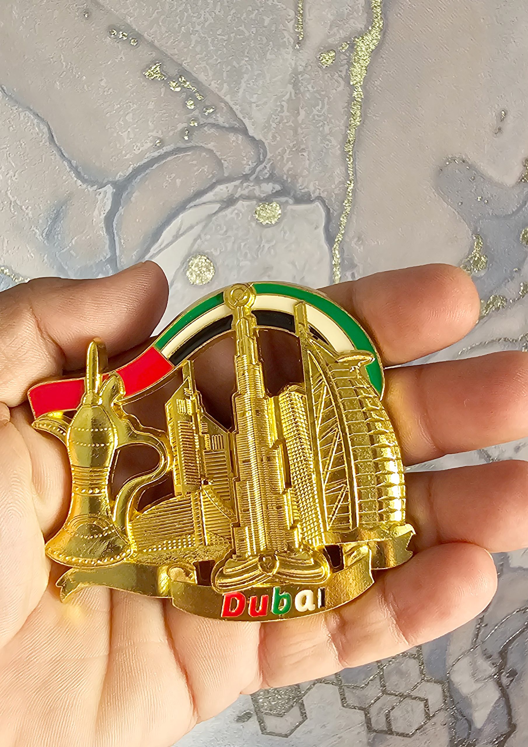 This high-quality metal magnet features a minimalist yet elegant golden Dubai design. Perfect for souvenirs or as a unique decorative item, it serves as a great reminder of your trip to Dubai. A perfect gift or collectible for those who love Dubai’s iconic charm.