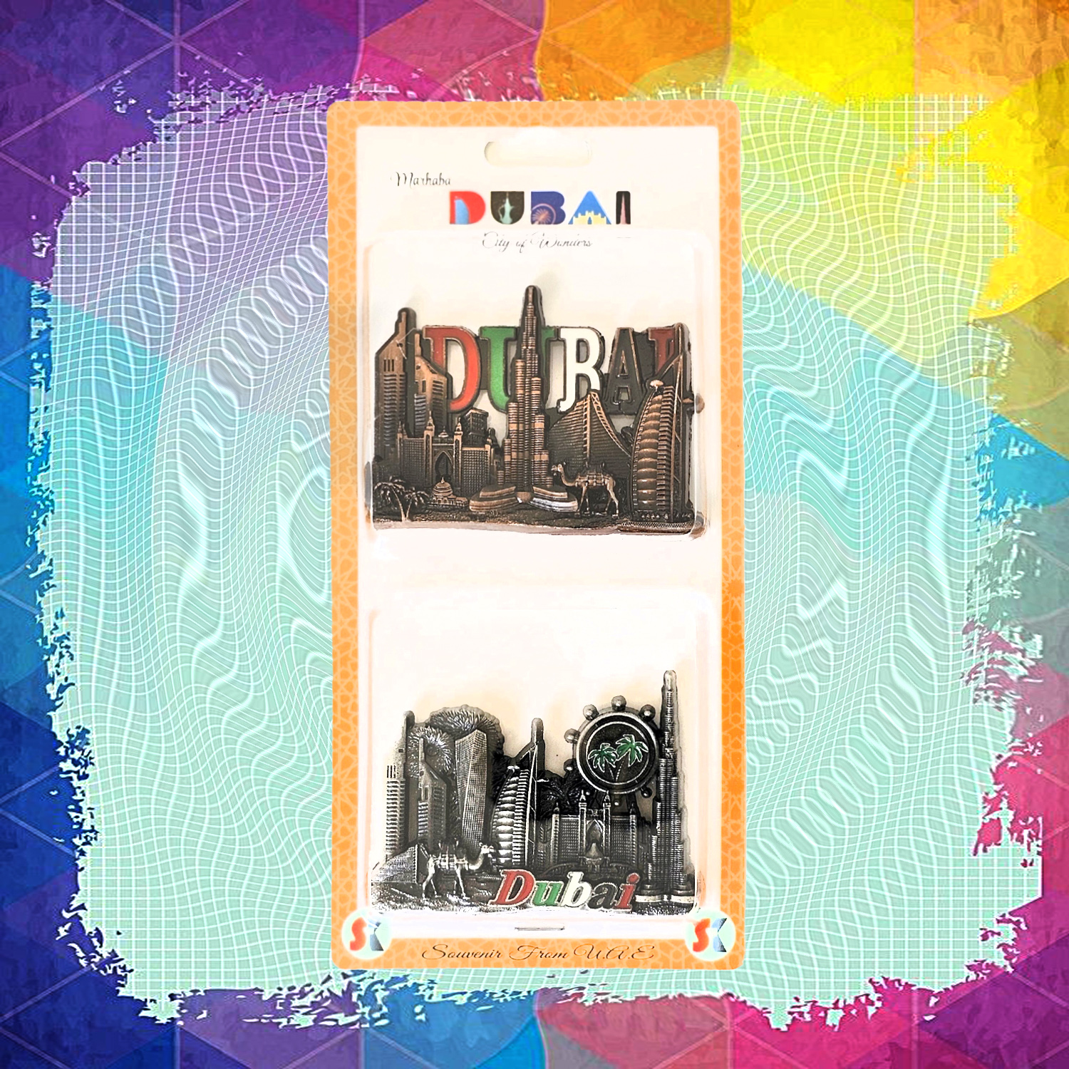 Buy Dubai UAE Metal Magnets 2pcs Small in silver and brown. A simple Dubai-themed design, perfect as souvenirs or gifts. Ideal for fridge or office decor. Explore the beauty of Dubai with this elegant set of magnets.