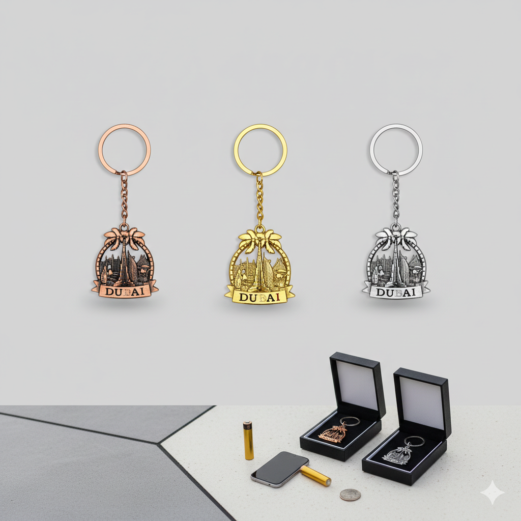Blending the Palm Island’s iconic design with Dubai’s futuristic skyline, this keychain serves as a stylish reminder of the city’s remarkable journey.