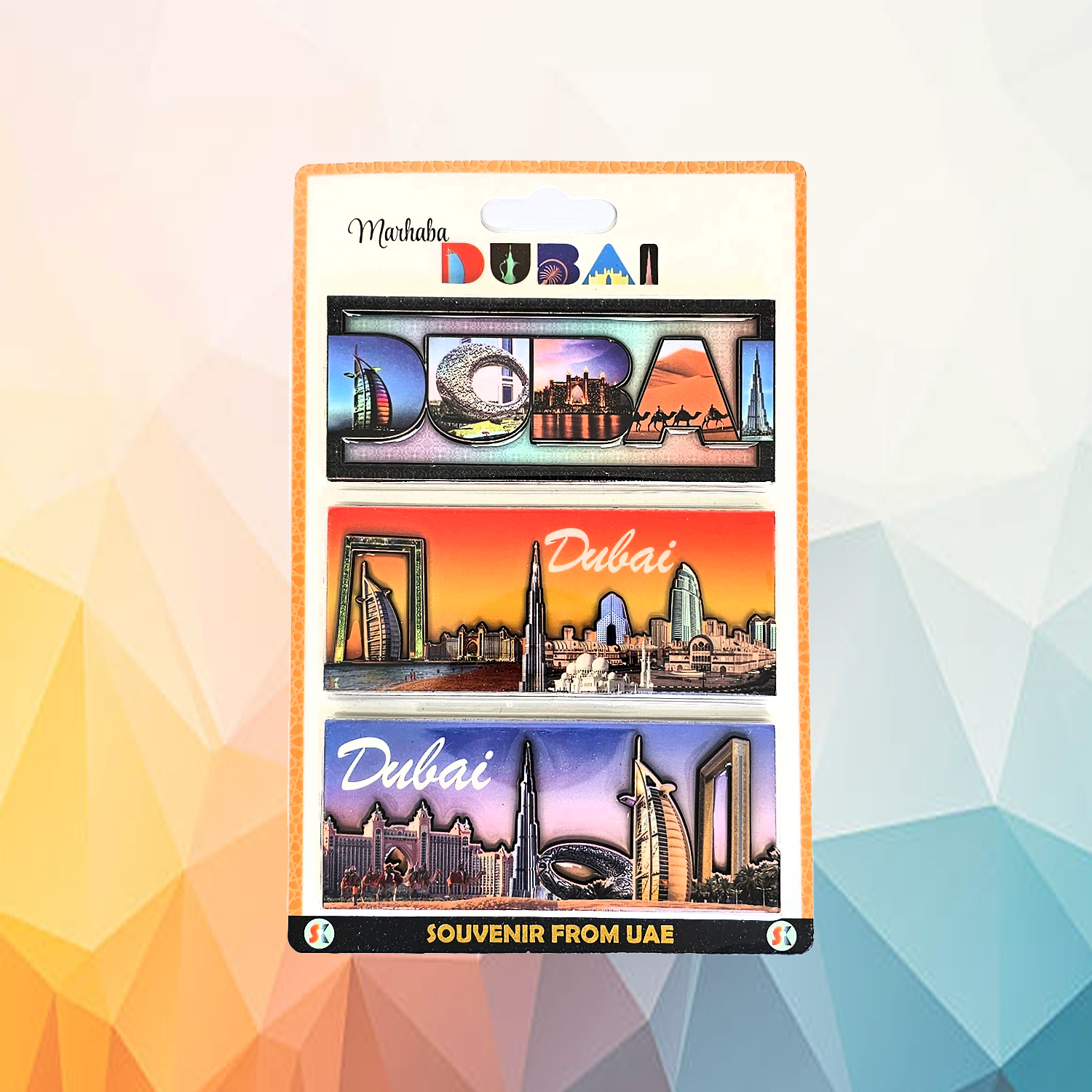 Bring home a piece of Dubai with this elegant set of 3 coaster fridge magnets. Crafted with vibrant colors—blue, orange, and sky blue—these magnets are perfect for adding a touch of charm to your home or as memorable gifts for loved ones. Functional and decorative, they capture the essence of Dubai in every detail.