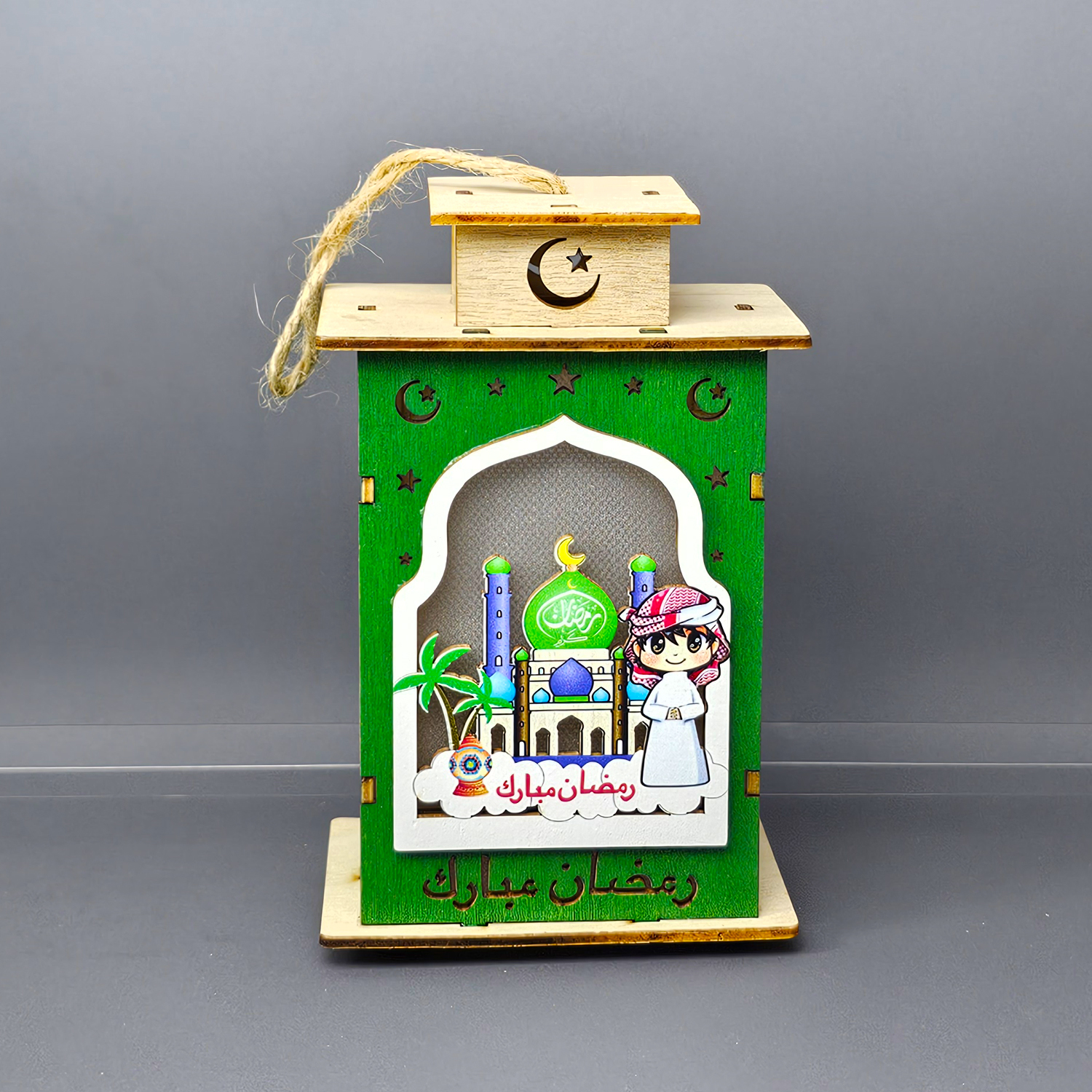 Beautifully crafted MDF wooden Ramadan lantern with warm LED lighting, perfect for creating a festive and spiritual ambiance.