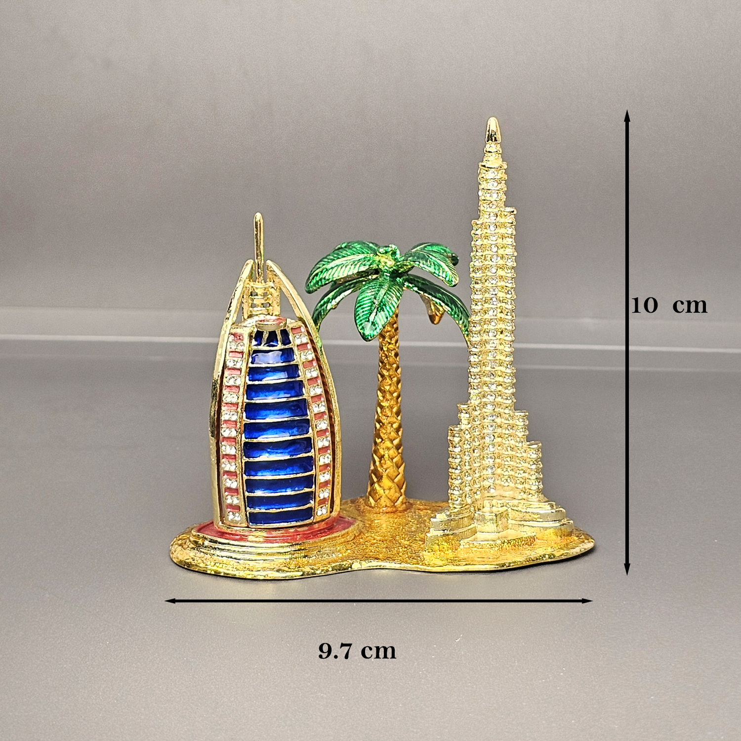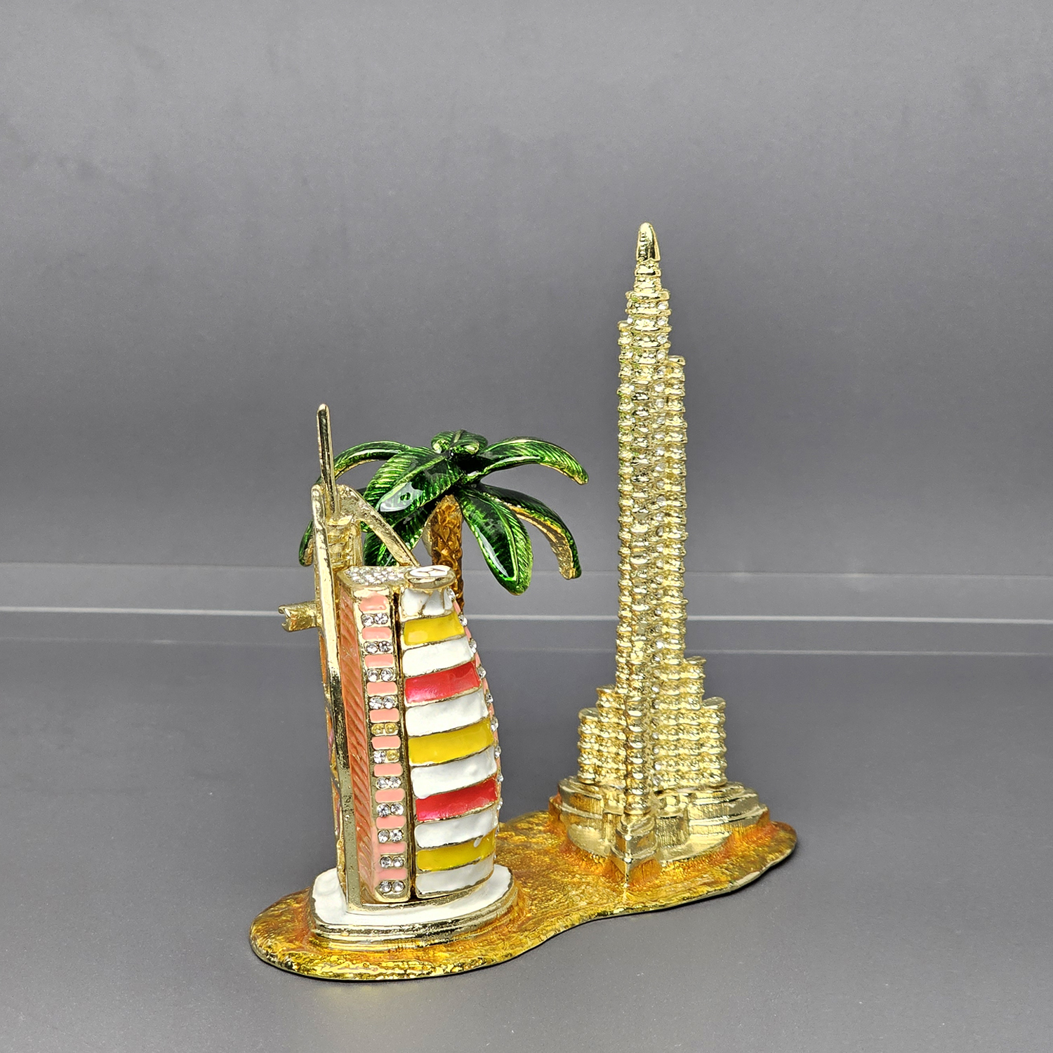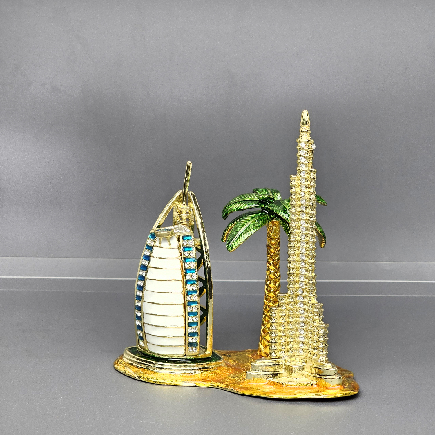 A stunning Dubai-themed decor piece featuring iconic skyscrapers and a palm tree, embellished with colorful enamel paint and sparkling stones.